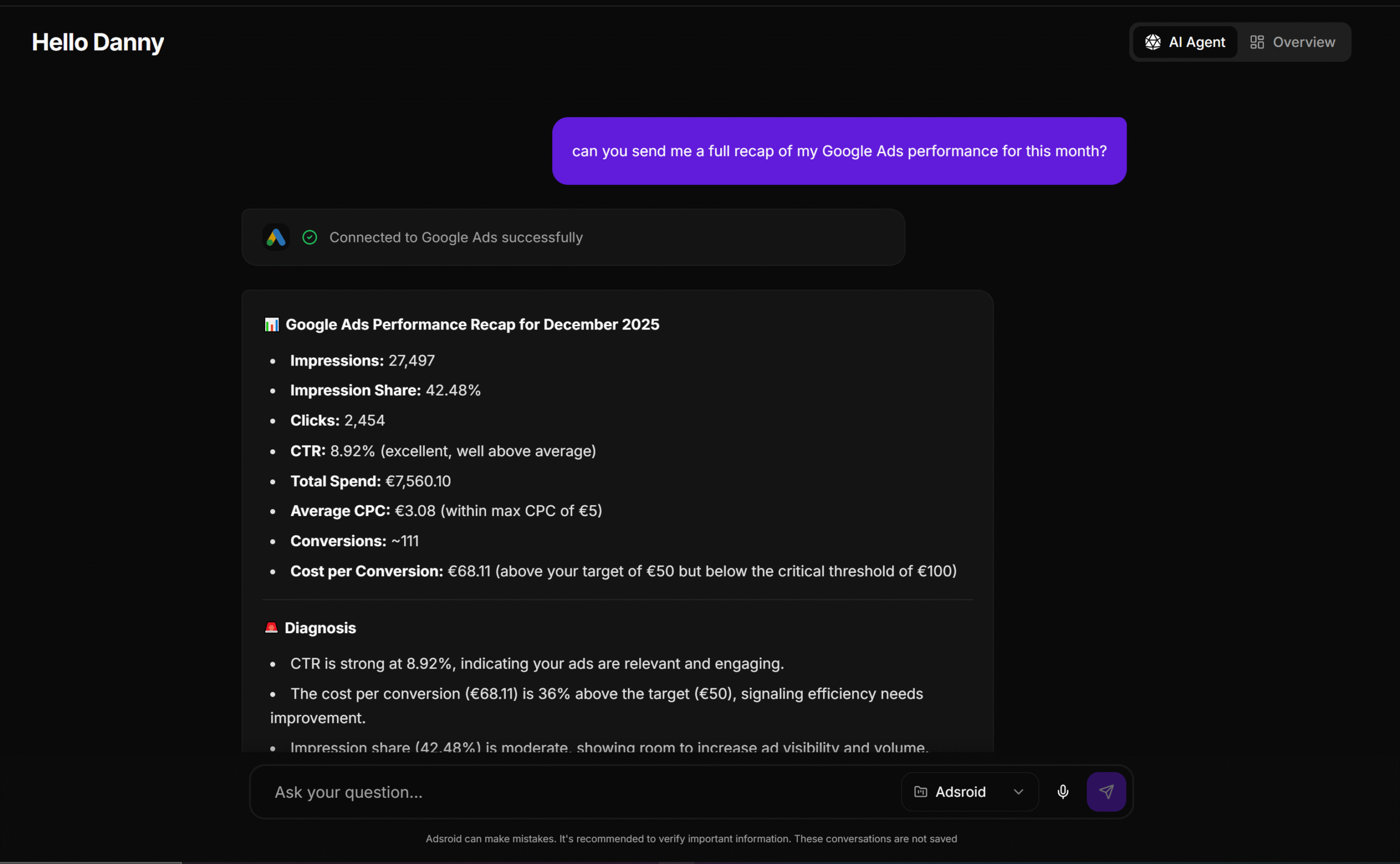 With Adsroid, this means working with your Google Ads data in a more intuitive way asking questions, exploring insights, and gaining confidence in your decisions without technical effort.